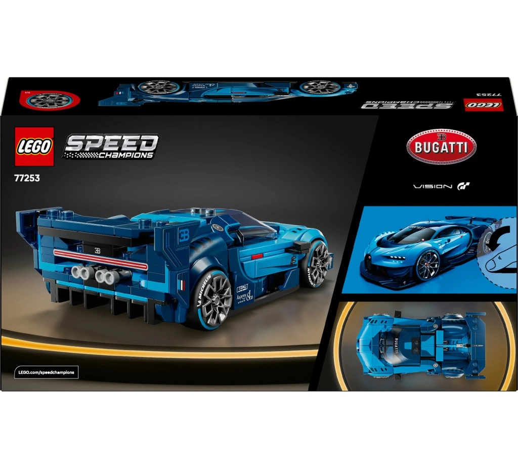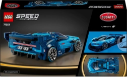 Zažite adrenalín šampiónov s modelom BUGATTI Vision GT, ktorý ohromí presným tvarom karosérie, prednou podkovovitou maskou s číslom 16, ôsmimi svetlometmi, strešnou plutvou a výrazným zadným krídlom. Široké pneumatiky s potlačou dodávajú vozidlu realistický pretekársky vzhľad a minifigúrka jazdca v oblečení s logom BUGATTI sa pohodlne zmestí do kokpitu.