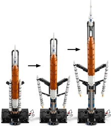 Táto stavebnica prináša pôsobivú kombináciu technickej presnosti a zábavy. Model verne zobrazuje stupňovitý štart rakety SLS vrátane oddelenia pevných urýchľovacích blokov, centrálneho stupňa a horného stupňa s motorovým modulom a kozmickou loďou ORION. Celý mechanizmus je poháňaný otáčaním kľuky na pevnom podstavci s informačným panelom a logami NASA, ESA a programu ARTEMIS.