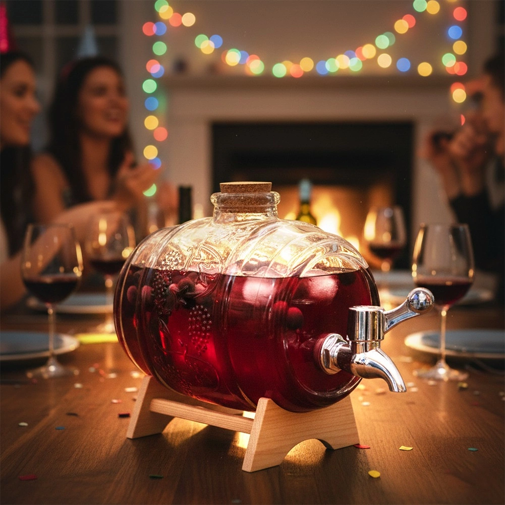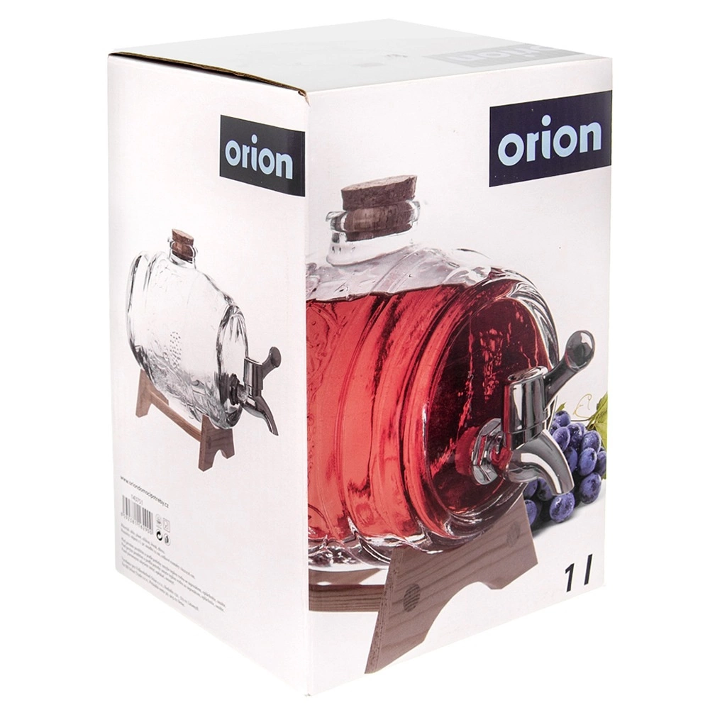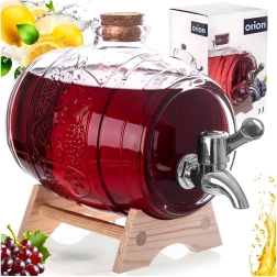 Štýlový sklenený dávkovač nápojov s objemom 1 l so stojanom z dreva, kovovým kohútikom a prírodným korkovým uzáverom. Ideálny na limonády, punče, šťavy aj domáce vína na záhradné párty aj rodinné stretnutia. Hrubé sklo s dekoratívnym reliéfom v tvare súdka zabezpečí odolnosť aj atraktívny vzhľad.