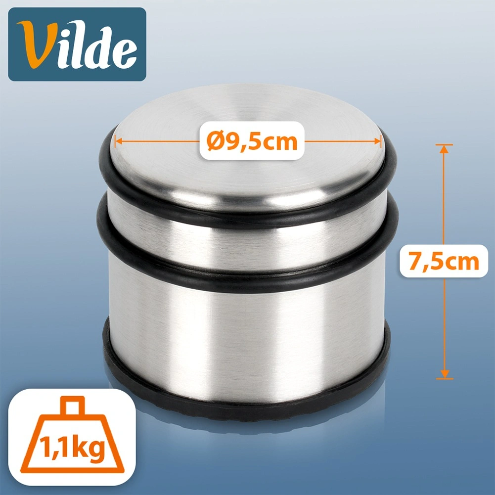 Elegantný a ťažký stoper na dvere z nehrdzavejúcej ocele v striebornej farbe je ideálny do bytu, domu aj kancelárie. Vysoká hmotnosť 1,1 kg zaisťuje stabilitu, takže dvere zostanú tam, kde ich potrebujete. Gumové prstence po obvode chránia dvere pred nárazmi a gumová základňa bráni kĺzaniu a chráni podlahu.
