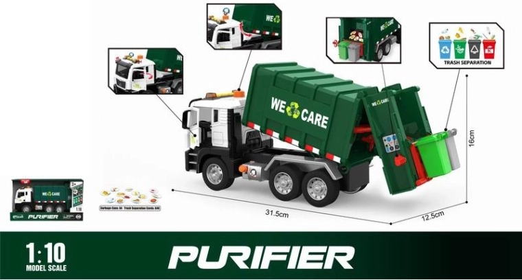 Toto detailne spracované smetiarske auto s dĺžkou 31,5 cm prináša deťom množstvo zábavy aj učenia. Reálne proporcie, odolné prevedenie a svetelné a zvukové efekty pomáhajú rozvíjať predstavivosť a motorické schopnosti pri hre na upratovanie mesta.