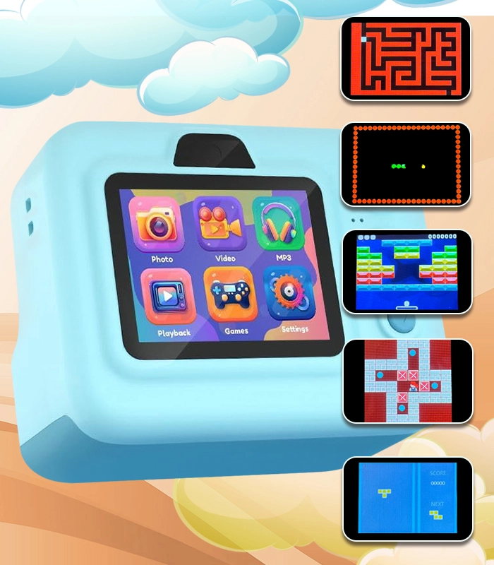 Fotoaparát kombinuje fotografovanie, video v 1080P a mini hry (hádanky, had, pinball, sokoban) pre zábavu aj rozvoj kreativity. Jasný 2,4" displej a intuitívne ovládanie uľahčí deťom prezeranie a prácu s fotkami aj videami. Podpora pamäťových kariet microSD až 32 GB poskytne dosť miesta na spomienky.