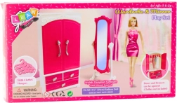 Elegantný set nábytku pre bábiky s výškou cca 29 cm zahŕňa šatníkovú skriňu s otváracími dvierkami a zásuvkami, stojace zrkadlo so stabilnou základňou a sadu vešiakov. Odolné plastové prevedenie, pôvabná ružovo-biela kombinácia a detaily pre kreatívne hranie a organizáciu oblečkov.