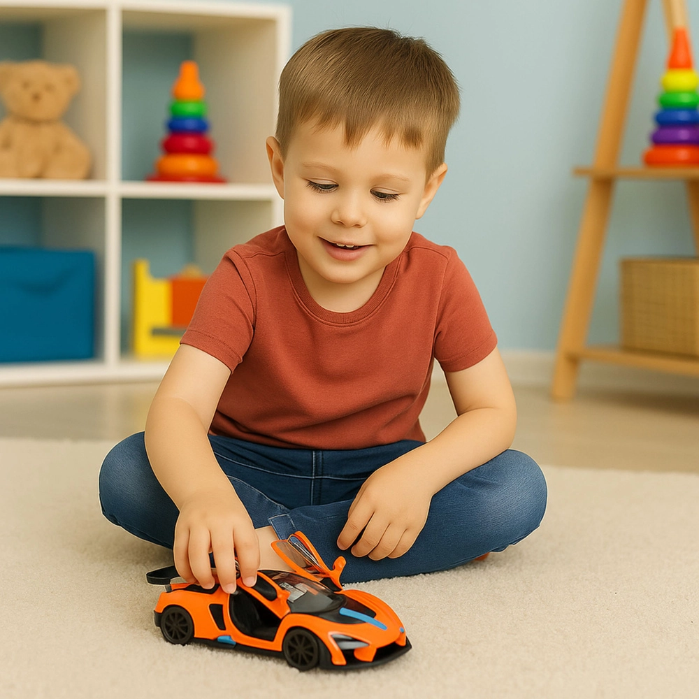 Štýlový model športového auta v mierke 1:32 ponúka kovovú karosériu, otváracie dvere a pull-back pohon pre dynamickú jazdu. Vďaka detailnému spracovaniu, športovému vzhľadu a odolnej konštrukcii je ideálny na hranie aj zbieranie.