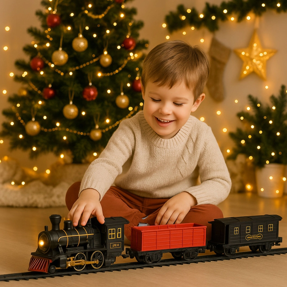 Lokomotíva s funkčným svetlom a zlatými detailmi vytvára autentickú atmosféru a láka k hre aj za šera. Plynulá jazda po koľajniciach podporuje predstavivosť detí.