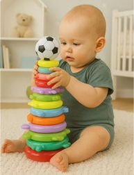 Táto vzdelávacia ukladajúca pyramída prináša chytrú zábavu pre najmenších. Dieťa ukladá farebné krúžky podľa veľkosti na stredový tŕň a na záver nasadí míček, ktorý motivuje k ďalším pokusom. Hračka podporuje koordináciu oko–ruka, rozvoj jemnej motoriky a logického myslenia.