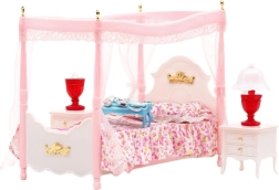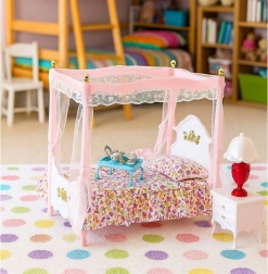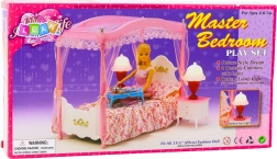 Elegantná súprava do spálne pre bábiky s výškou cca 29 cm očarí posteľou s baldachýnom, jemnými záclonkami a detailným spracovaním. Súčasťou sú dva nočné stolíky, lampičky a kompletná posteľná bielizeň. Pastelová ružovo-biela kombinácia a kvalitný materiál zaručujú odolnosť a dlhú zábavu pri rozvíjaní kreativity a fantázie.