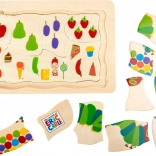 Farebné motívy ovocia a húsenice podporujú rozpoznávanie tvarov a farieb, precvičujú koordináciu oko–ruka a zlepšujú sústredenie.