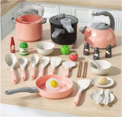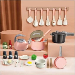 Objavte zábavu pri varení s touto veľkou detskou kuchynskou súpravou s 32 dielmi v jemných ružových a sivých tónoch. Realistické hrnce, panvica a čajník dopĺňa riad, príbory, koreničky a potraviny pre autentickú hru na kuchára. Bezpečné a odolné prevedenie podporuje kreativitu, jemnú motoriku aj spoločenské zručnosti počas hrania rolí.