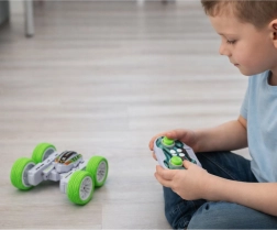 Ovládanie pomocou RC ovládača rozvíja koordináciu, reflexy a presnosť pohybov. Auto zvláda jazdu vpred/vzad, vľavo/vpravo, plné otočky 360° a reverznú jazdu po oboch stranách karosérie – ideálne pre akrobatické kúsky bez zastavenia.