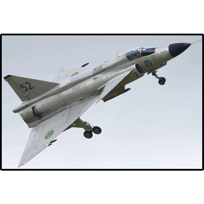 Precízne tvarovanie delta krídel, kačacích plôch a podvesenej výzbroje dopĺňajú odolné potlače švédskeho letectva – bez použitia nálepiek.