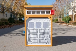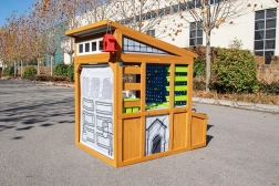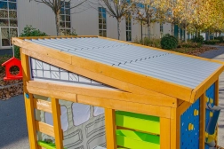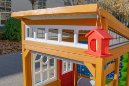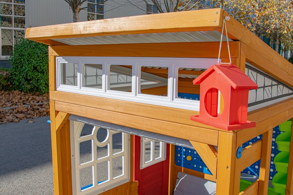Rolovacie „garážové“ brány s kľučkou, odolná lavica s nosnosťou 100 kg a detaily ako kŕmidlo pre vtáčiky a okenný truhlík prepájajú hru s okoľitou prírodou.