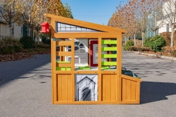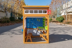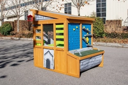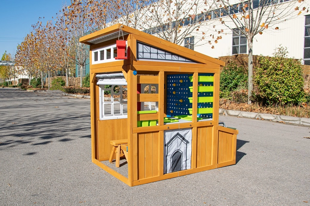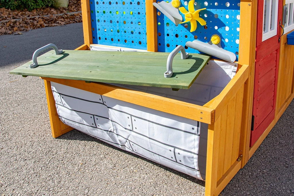 Záhradný domček Hobby Workshop premení vašu záhradu na bezpečné a podnetné ihrisko. Robustná drevená konštrukcia so šikmou strechou pripomína malú dielňu a láka k nápaditej hre. Deti si užijú otváranie a zatváranie rolovacích brán s kľučkou, experimentovanie na kolíkovej stene aj prácu na zvýšenom stole s praktickou pracovnou doskou.