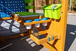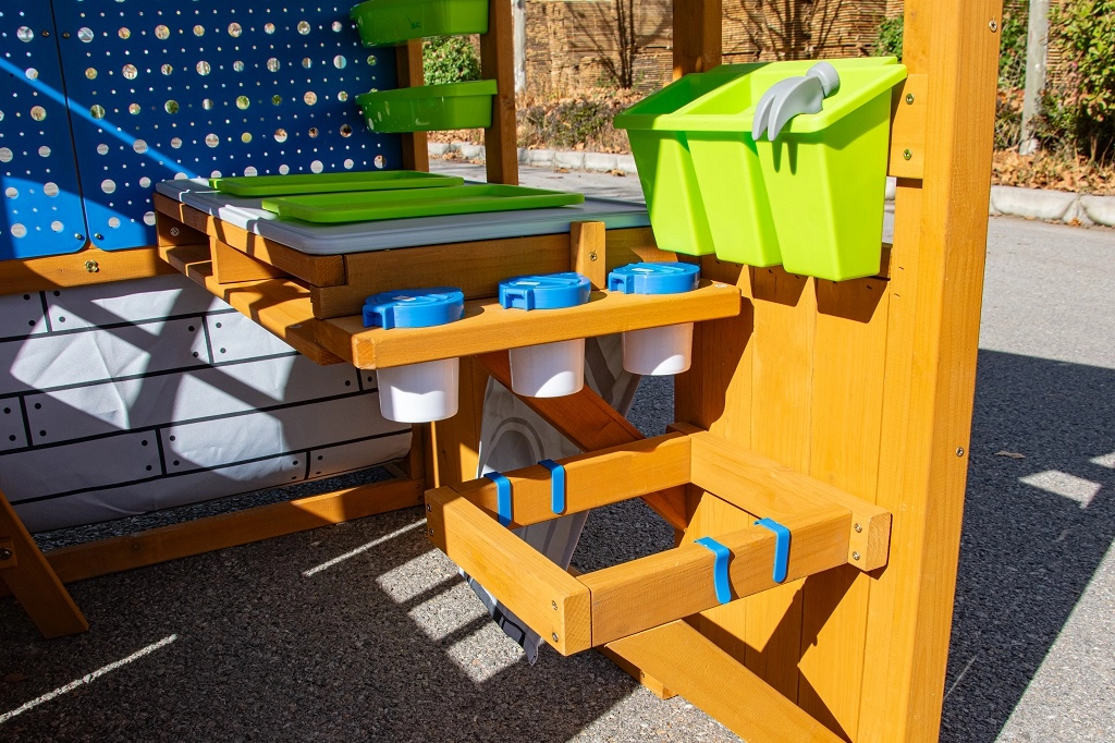 Zvýšený stôl s pracovnou doskou, poličkami, košmi a kelímkami udrží náradie aj materiály vždy po ruke. Deti si osvoja organizáciu a samostatnosť pri tvorení aj pokusoch.