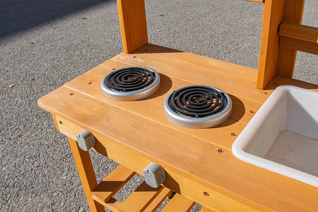 Táto vonkajšia detská kuchynka je ideálna pre „mud kitchen“ aktivity aj klasickú hru na varenie. Robustná drevená konštrukcia sa ľahko udržiava a ponúka stabilnú pracovnú plochu s dvoma varičmi, plastovým drezom a praktickými háčikmi a držiakmi na príslušenstvo. Zásobník s kohútikom umožní bezpečné a zábavné experimenty s vodou.
