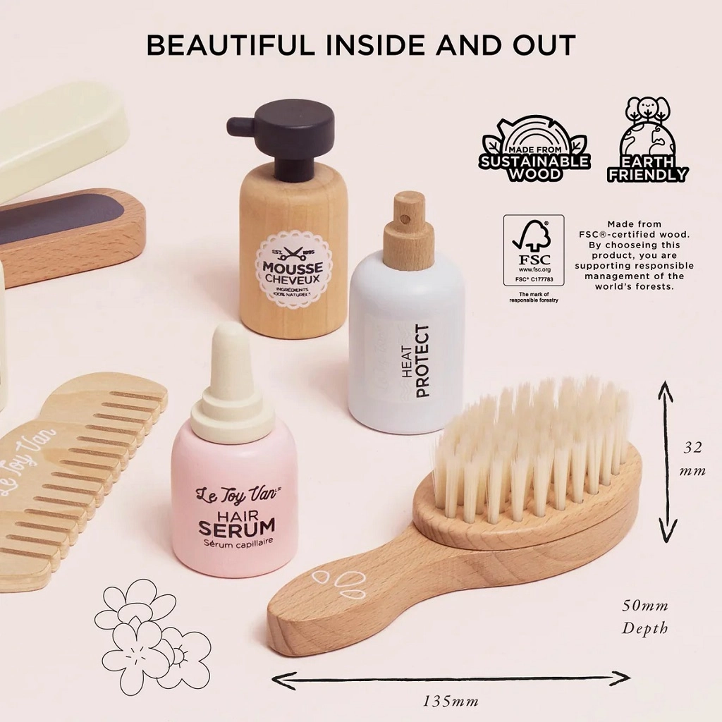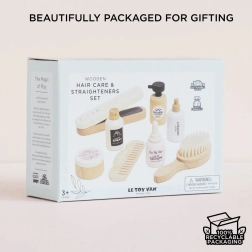 Detská kadernícka sada Le Toy Van prináša hodiny kreatívnej zábavy pre malé stylistky a stylistov. Obsahuje 8 kvalitných drevených dielov vrátane žehličky na vlasy, kefy, hrebeňa a kozmetických doplnkov na fiktívnu starostlivosť o vlasy. Je vyrobená z FSC certifikovaného dreva, ručne domalovaná netoxickými, vodou riediteľnými farbami a spĺňa prísne bezpečnostné štandardy. Rozvíja predstavivosť, sociálne zručnosti a jemnú motoriku detí od 3 rokov.
