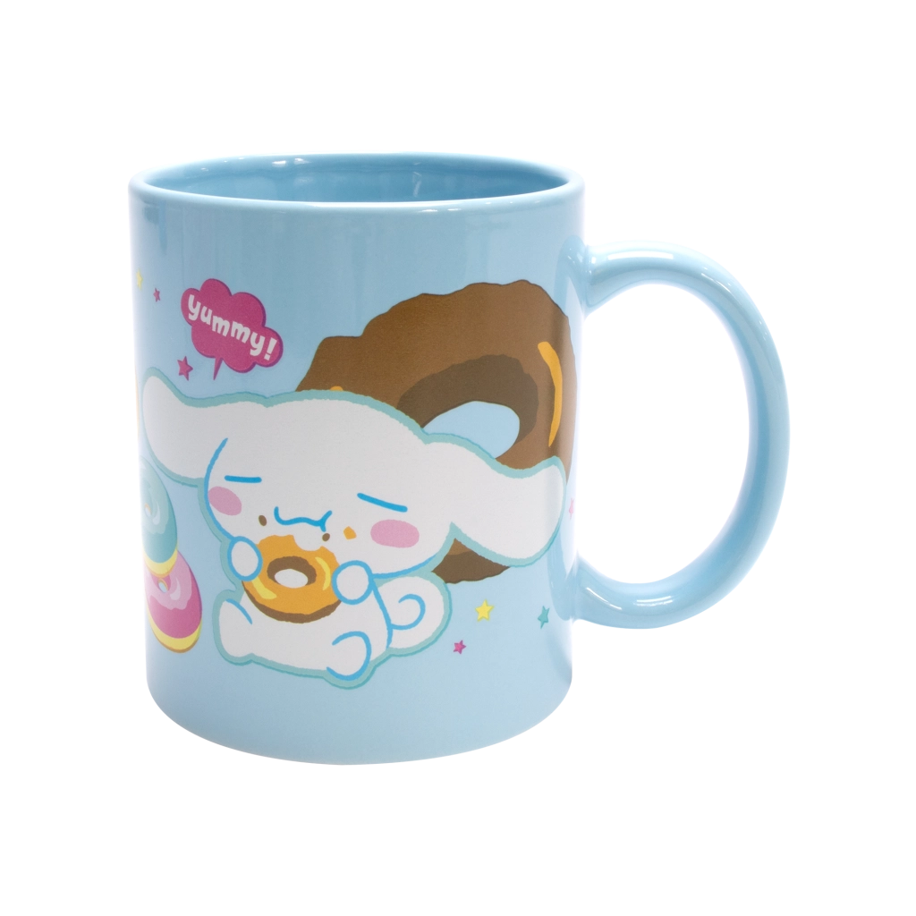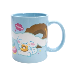 Svetlomodrý keramický hrnček s potlačou Cinnamoroll a donutov, ideálny na rannú kávu aj večerný čaj. Lesklá glazúra a pohodlné uško pre príjemné držanie.