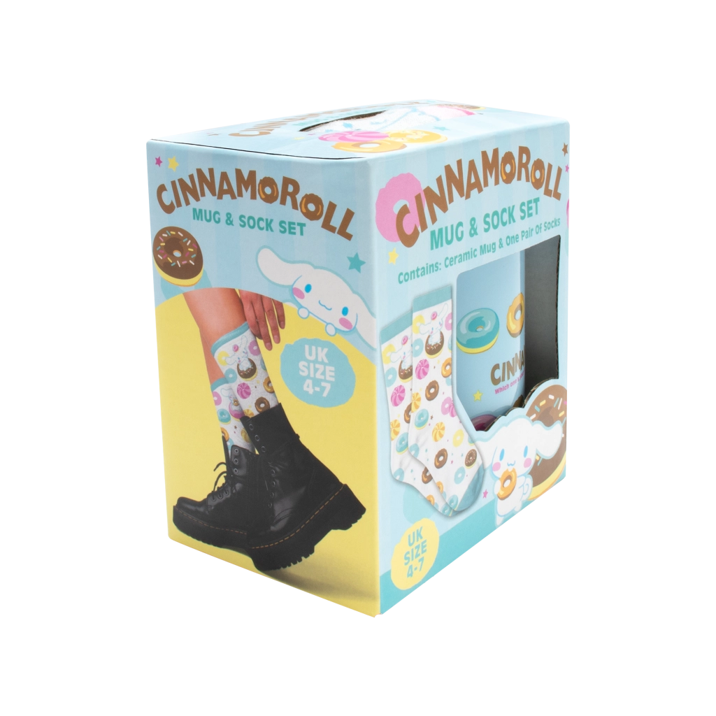 Roztomilý darčekový set pre milovníkov Cinnamoroll: svetlomodrý keramický hrnček 330 ml a pohodlné členkové ponožky 37–40. Štýlový dizajn s donutmi a postavičkou Cinnamoroll, ideálny ako darček pre fanúšikov aj zberateľov. Hrnček s farebnou potlačou, ponožky z mäkkého a pružného materiálu pre celodenný komfort.