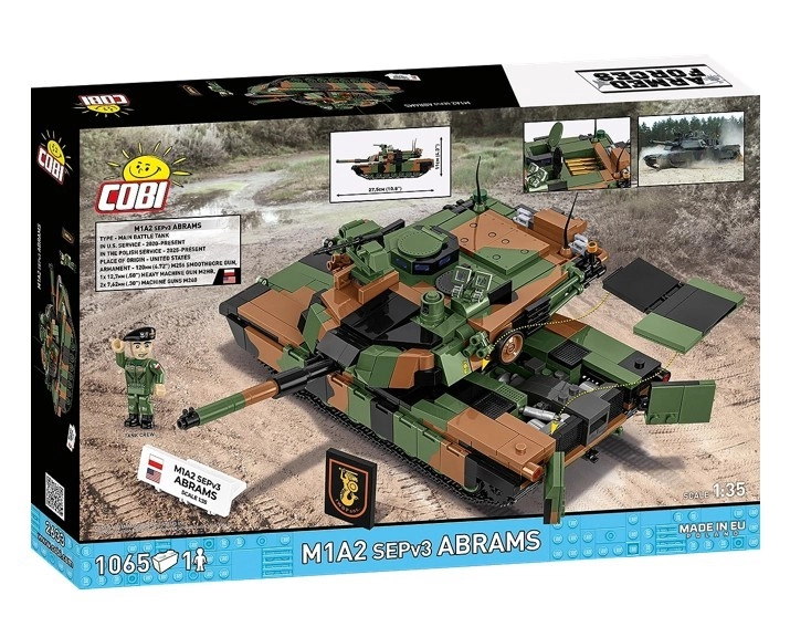 Model poteší zberateľov aj staviteľov: vo vnútri nájdete otváracie poklopy a zadné servisné sekcie, dve pohyblivé zbrane (M2 Browning a M240) a precízne potlače taktických a historických znakov – bez samolepiek. Súčasťou je minifigúrka poľského tankistu s charakteristickou výstrojou a dvojica tabuliek s názvom, mierkou a vlajkami.