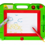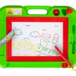 Detská magnetická kresliaca tabuľka od značky LENA podporuje kreativitu a jemnú motoriku. Súčasťou je pero na šnúrke, 2 magnetické pečiatky a lišta na rýchle mazanie, vďaka ktorej deti ľahko začnú znova kresliť. Pri písaní kovovým hrotom sa farebná plocha mení a vytvára živé obrázky.
