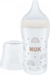 Integrovaný NUK kontrolný ukazovateľ teploty mení farbu z modrej (studené) na bielu (príliš horúce), aby pomohol predísť podávaniu príliš horúceho príkrmu. Ideálna je teplota okolo 37 °C, keď je ukazovateľ modrý. Fľaša je vyrobená z odolného, hygienického skla, je bez BPA a spĺňa európsku normu EN 14350.