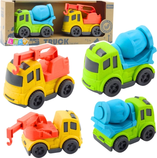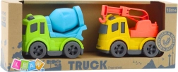 Pohybové prvky – otočný bubon pri miešačke a výsuvný, otočný hák pri odťahovke – rozvíjajú koordináciu oko–ruka a podporujú predstavivosť. Autíčka sú ľahké, dobre sa držia a skvele ich využijete v izbičke, na záhrade aj v parku.
