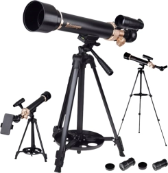 Objavte nočnú oblohu s ľahkým a stabilným hliníkovým teleskopom 50/500 na statíve s výškou až 1,35 m. Ideálny pre deti aj dospelých na pozorovanie Mesiaca, jasných planét, prírody aj krajiny. Vymeniteľné okuláre poskytujú priblíženie 30× a 60×, nechýba hľadáčik, zenitové zrkadielko, držiak na telefón a bezpečný slnečný filter na pozorovanie Slnka po správnej inštalácii.