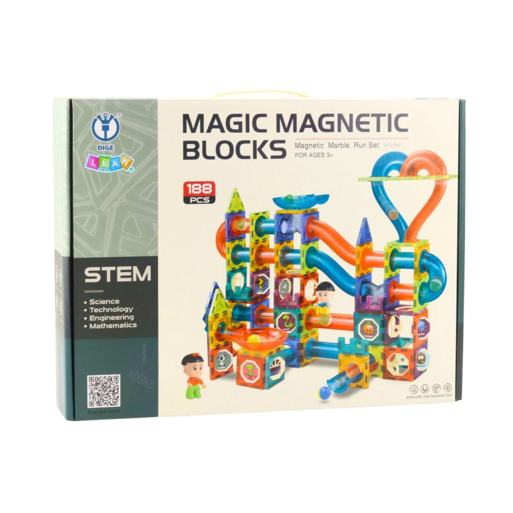 Stavebnica MAGIC MAGNETIC BLOCKS prináša spojenie tvorivej hry a učenia. Farebné, priehľadné diely, trubičky, zákruty a šmykľavky umožňujú stavať originálne guľôčkové dráhy, ktoré možno vďaka magnetickým spojom ľubovoľne rozširovať a prestavovať. Hra rozvíja koordináciu ruka–oko, riešenie problémov aj tímovú spoluprácu.
