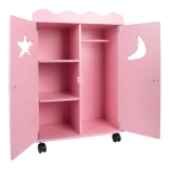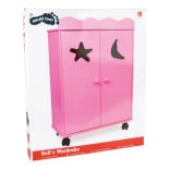 Táto kvalitná drevená skrinka v jemnej ružovej farbe je ideálna na prehľadné uloženie oblečenia a doplnkov vašich bábik. Ľavá časť ponúka dve praktické police, pravá strana je vybavená závesnou tyčou na šatočky. Dvierka s magnetickým zatváraním sa ľahko ovládajú a výrezy hviezdy a mesiaca dodávajú nábytku pôvabný vzhľad.