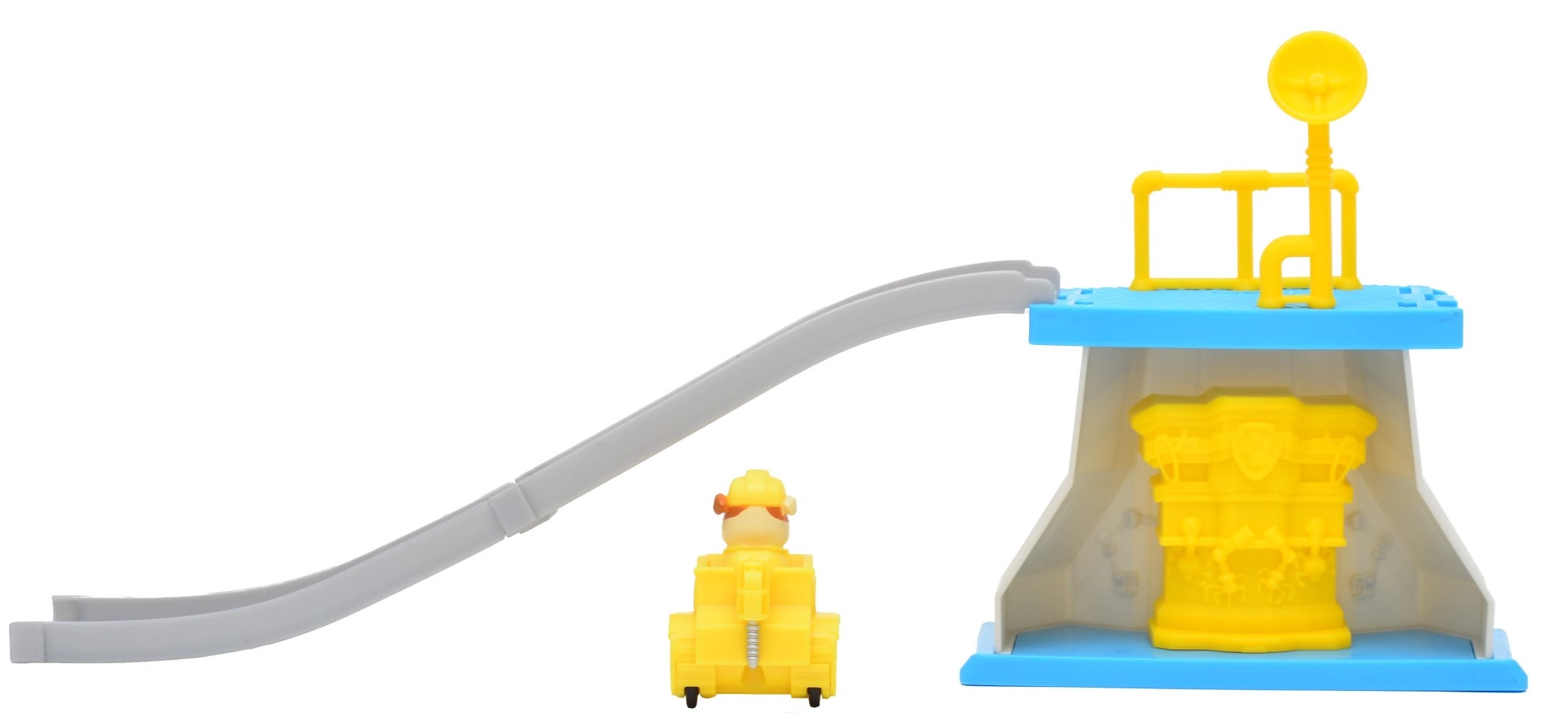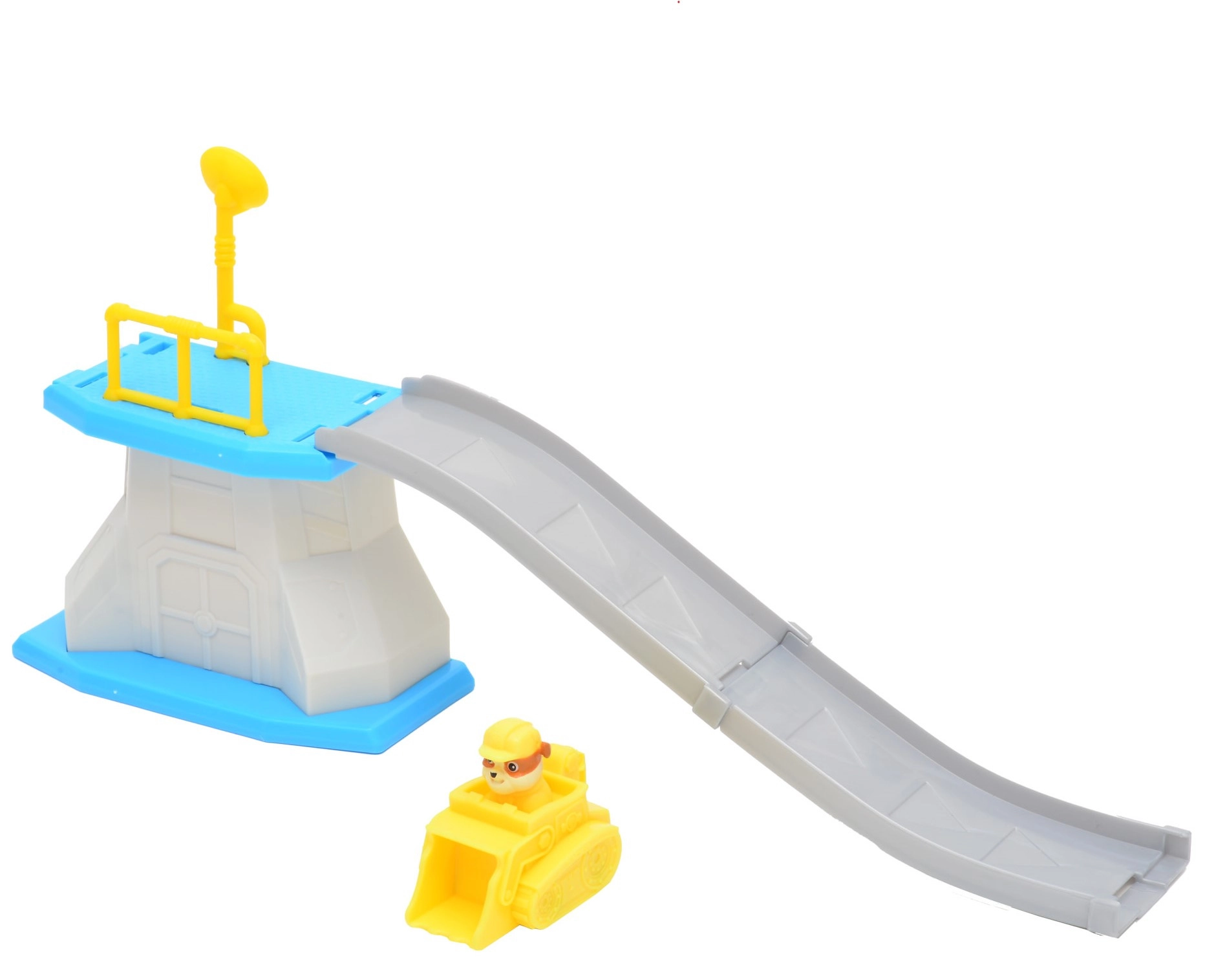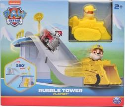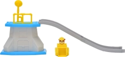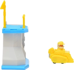 Súčasťou je žltý buldozér s integrovanou figúrkou Rubble – ideálny na rýchly štart z platformy a hranie príbehov PAW PATROL.