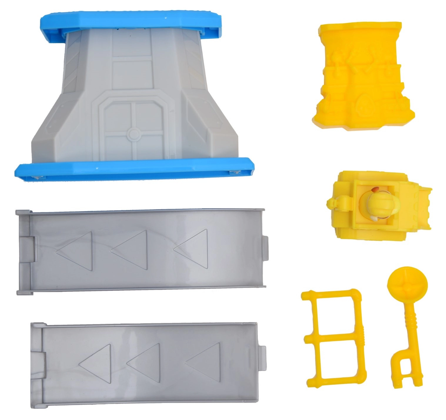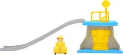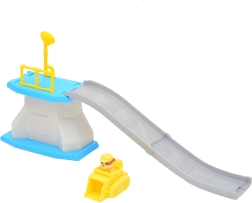 Zakrivená sivá rampa s modrou platformou a žltým zábradlím zaručí plynulý zjazd vozidla a množstvo dynamickej zábavy.