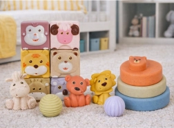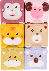 Obsahuje štvorcové kocky so zvieracími motívmi, okrúhle diely na stavanie veže, stláčacie figúrky a senzorické loptičky. Hračky sú vhodné na suchú hru aj do kúpeľa, rýchlo schnú a jednoducho sa čistia – ideálne na každodenné používanie doma aj na cestách.