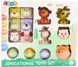 - 6× štvorcové kocky so zvieratkami, 6× okrúhle diely na stavanie veže, 3× figúrky zvierat, 3× senzorické loptičky