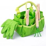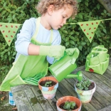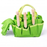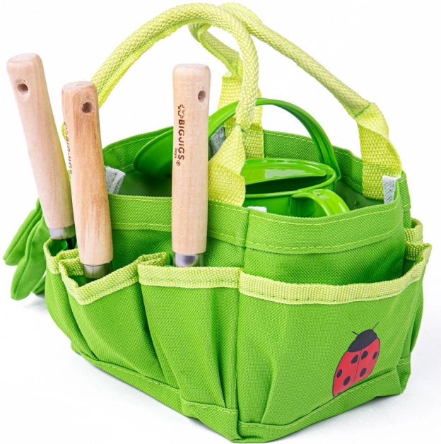 Tento zelený záhradnícky set pre deti od BIGJIGS TOYS podporuje učenie hrou a lásku k prírode. Plátená taška s motívom lienok udrží všetko vybavenie prehľadne poruke, zatiaľ čo kvalitné drevené madlá a kovové nadstavce náradia zabezpečujú bezpečné a odolné používanie. Ideálny na prvé sadenie, presádzanie a zalievanie s rodičmi.