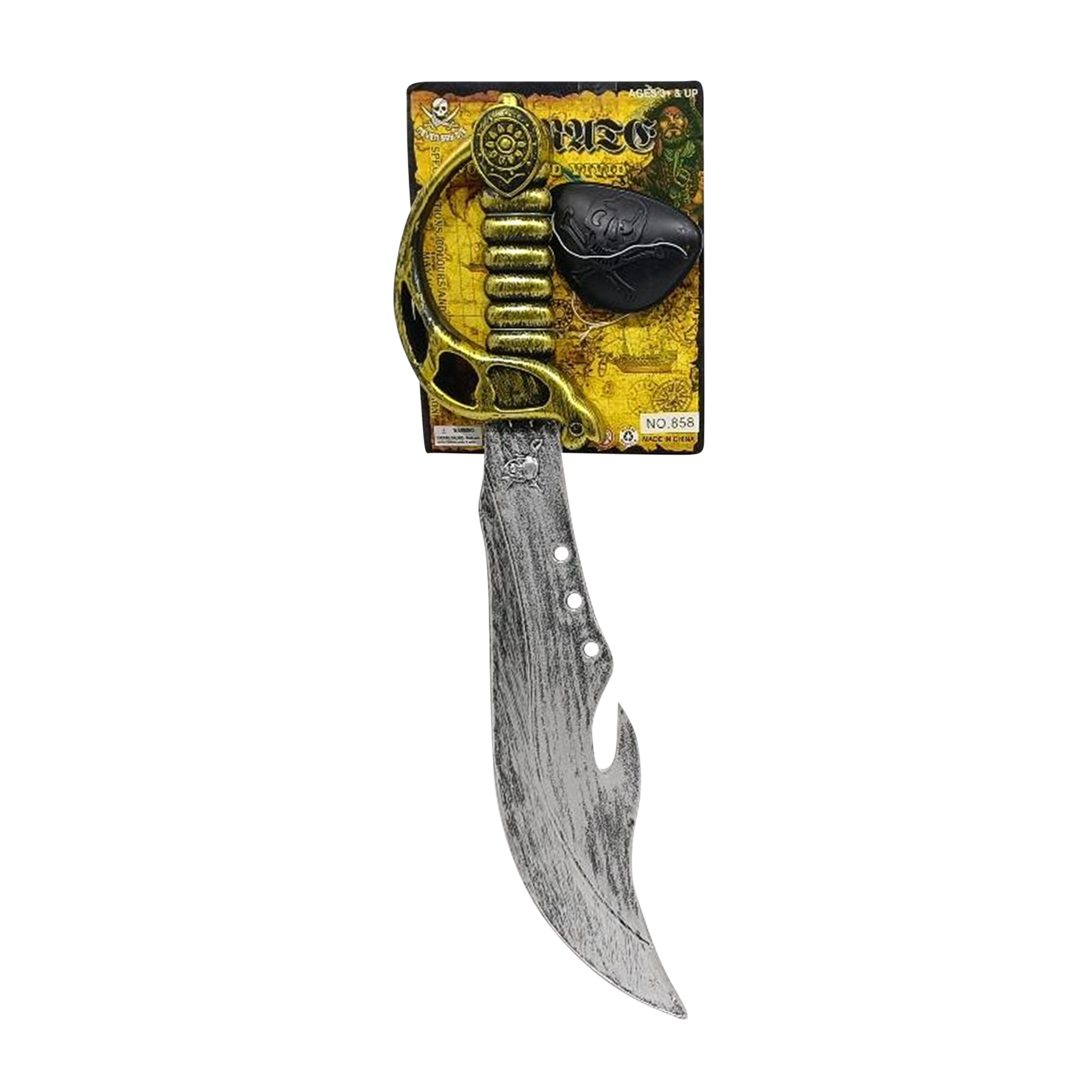 Zakrivená šabľa s patinovanou čepeľou a lebkou na rukoväti dodá kostýmu realistické detaily, ktoré zaujmú na prvý pohľad.