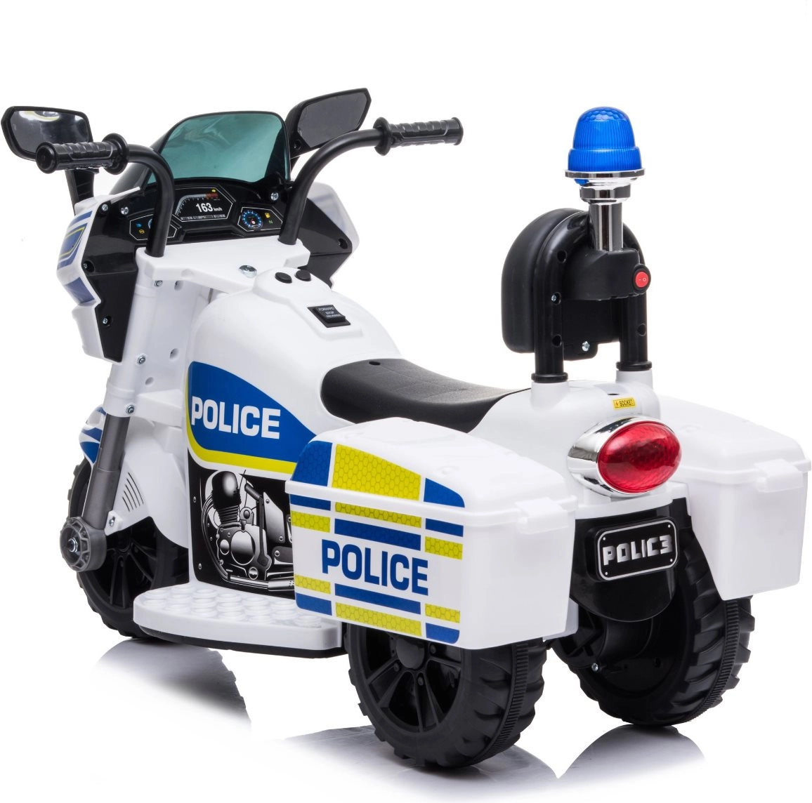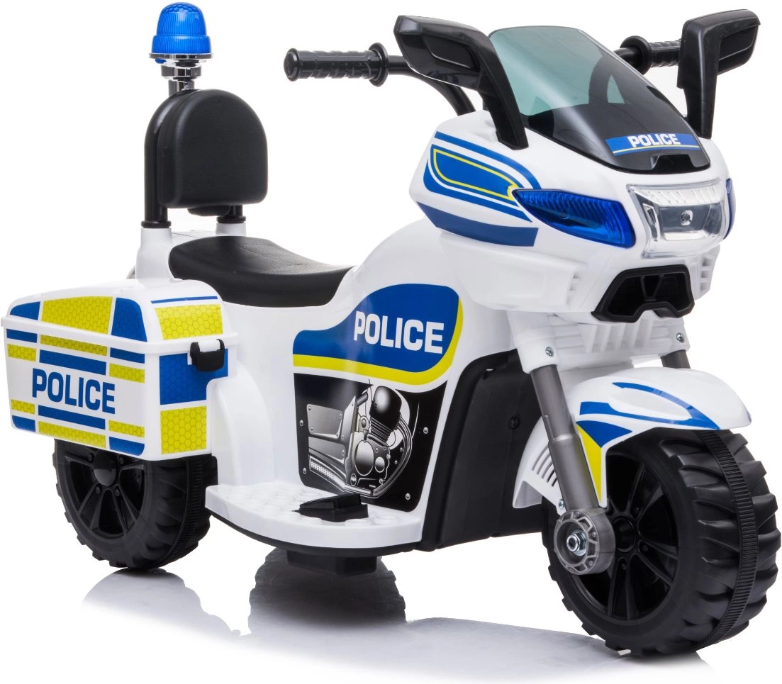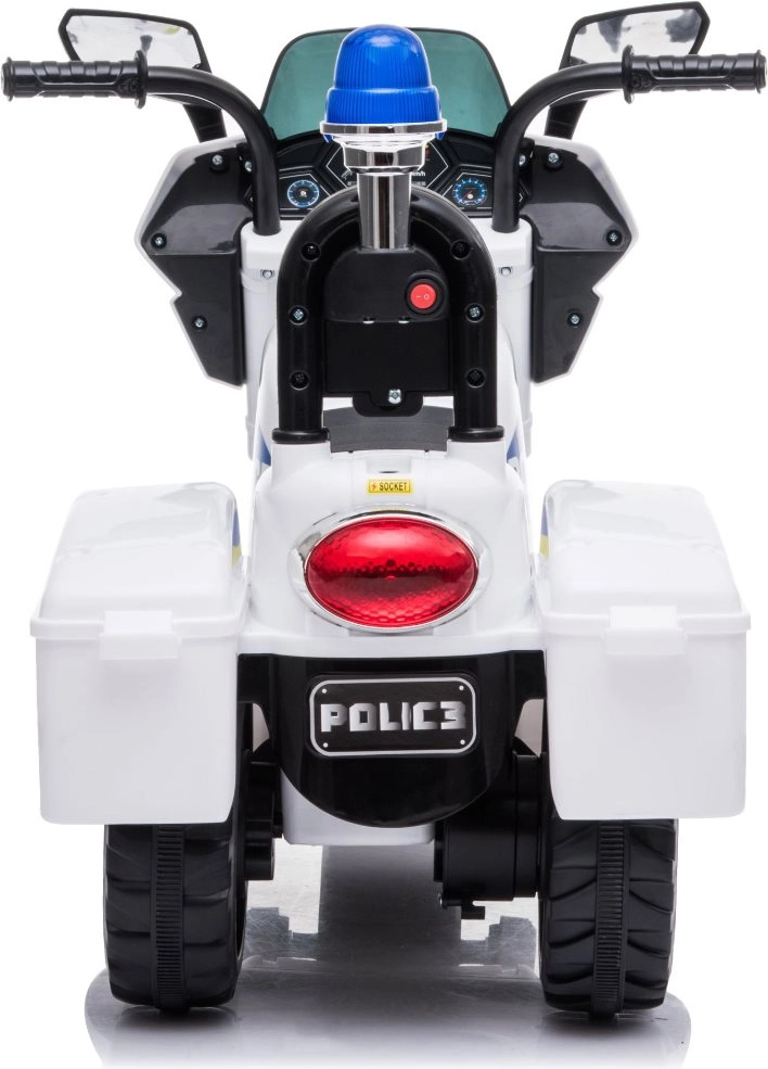 Štýlová detská elektrická policajná motorka v bielo‑modrom prevedení prináša realistickú policajnú akciu s blikajúcimi svetlami, zvukom sirény a jednoduchým ovládaním vpred/vzad. Stabilná trojkolová konštrukcia, ergonomické sedadlo s operadlom a rýchlosť až 3 km/h zaručujú bezpečnú zábavu doma aj vonku. Integrovaný MP3 vstup, klaksón a hudobné tlačidlá podporia hru na hrdinov a rozvoj koordinácie.