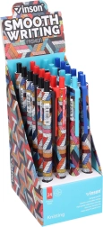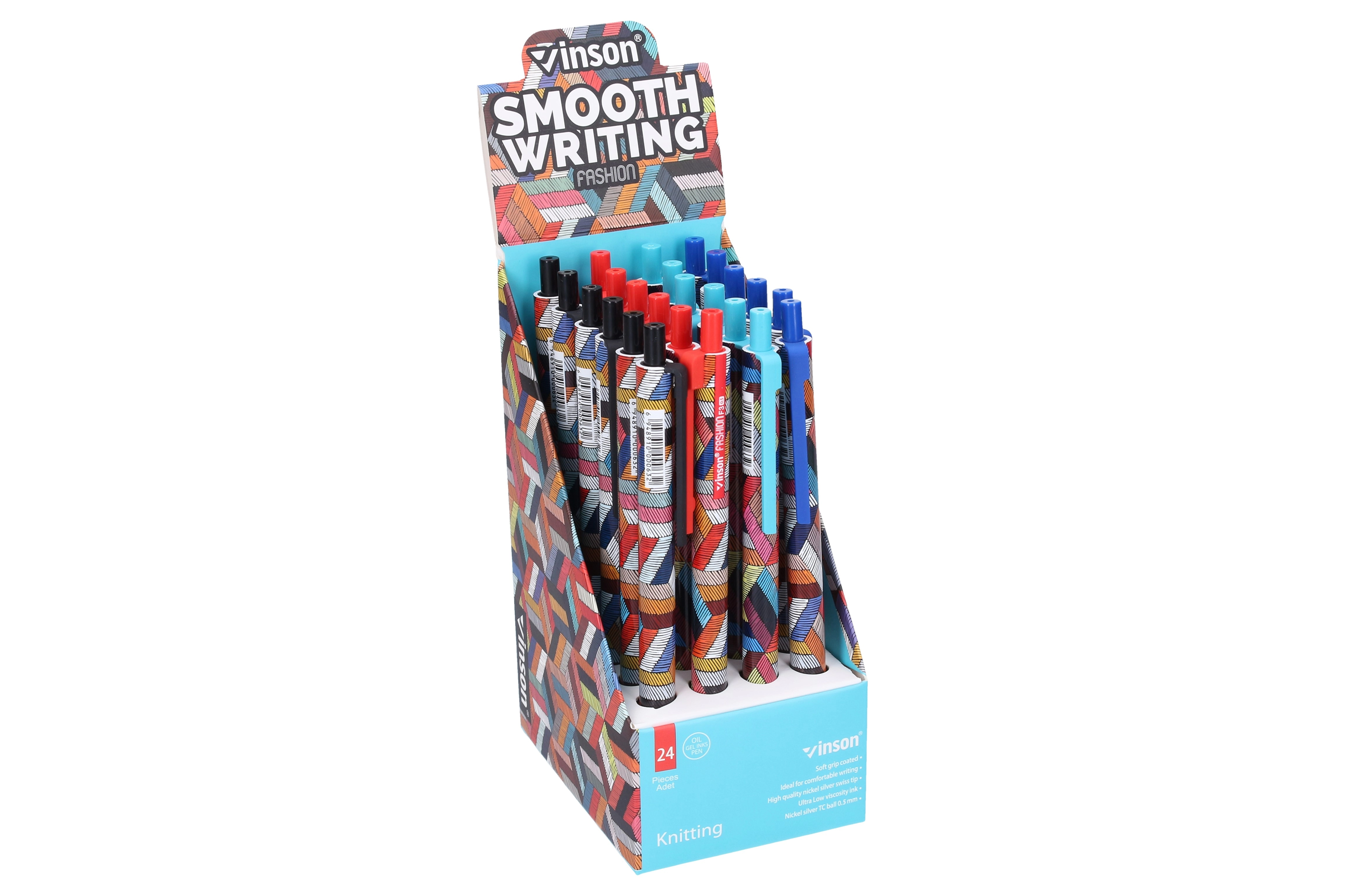 Môžete si vybrať zo 4 farebných variantov vrchnáčika – čierna, červená, svetlomodrá a modrá – a zladiť tak pero so svojím štýlom alebo organizáciou. Balené po 24 kusoch v display boxe, vhodné pre predajne, kancelárie aj školy.