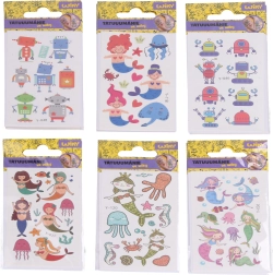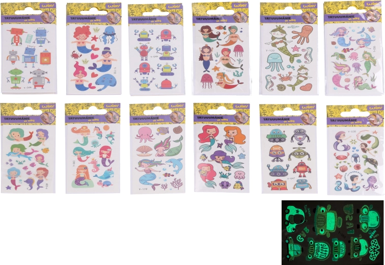 Dočasné tetovanie, ktoré zažiari! Tieto tetovacie obtlačky ponúkajú pestrý mix motívov a po nasvietení svietia v tme, takže sa skvele hodia na oslavy, festivaly aj kostýmy. Sú šetrné k pokožke a ľahko sa aplikujú pomocou vody.