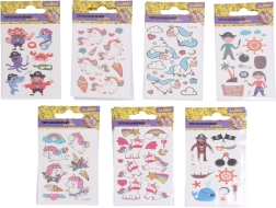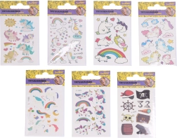 Zábavné detské tetovacie obtlačky, ktoré v tme svietia, potešia malých milovníkov fantázie aj dobrodružstva. Praktický formát 6 × 10,5 cm a veľký mix motívov jednorožcov a pirátov sa hodí na oslavy, darčeky aj každodenné hranie.