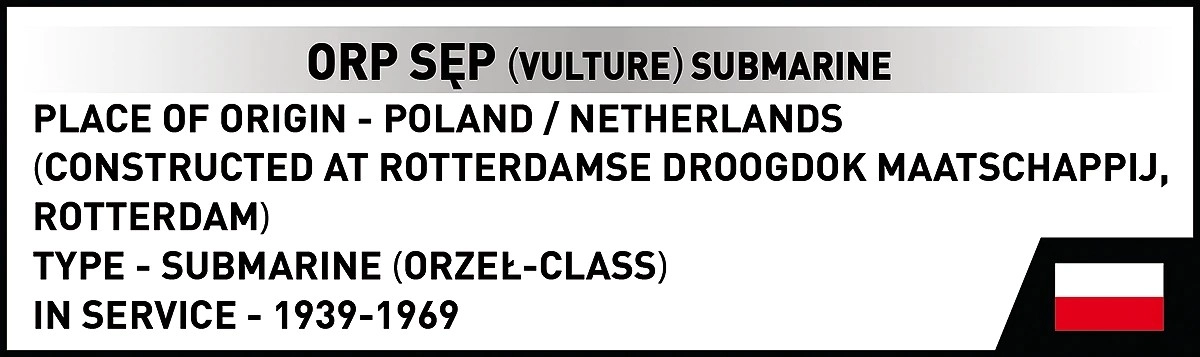ORP Sęp zo série COBI Historical Collection je detailný zberateľský model poľskej ponorky triedy Orzeł. Vďaka kompaktným rozmerom a starostlivo zvoleným farebným dielikom vynikne na poličke aj vo vitríne. Stavebnica vznikla v spolupráci s Múzeom námorníctva v Gdyni a spája pútavú históriu s precíznym spracovaním.