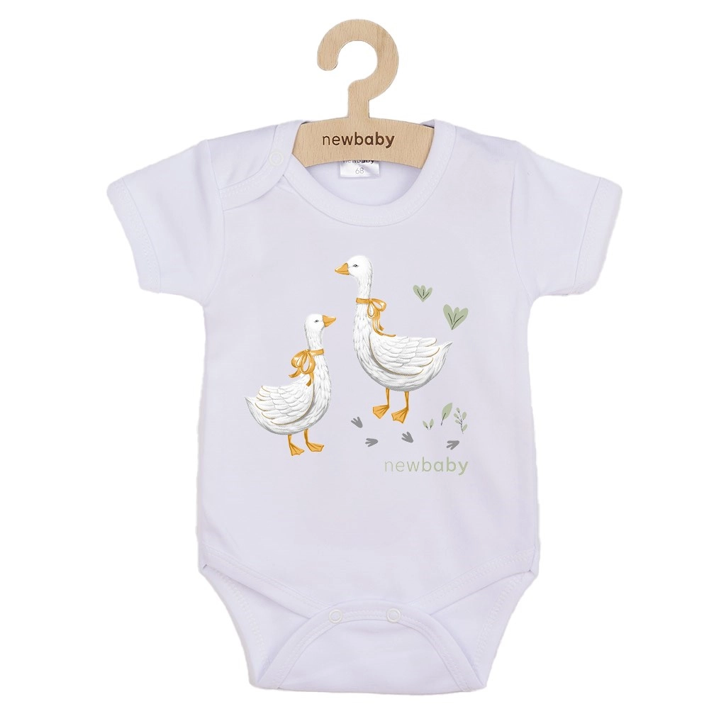 Roztomilé detské body zo 100 % bavlny s motívom húsok NEW BABY poteší jemnosťou a pohodlím na každý deň. Má praktické zapínanie na druky na ramenách a medzi nožičkami pre jednoduché prebaľovanie, je priedušné a šetrné k citlivej pokožke. Farby potlače sú certifikované a materiál spĺňa OEKO-TEX STANDARD 100.