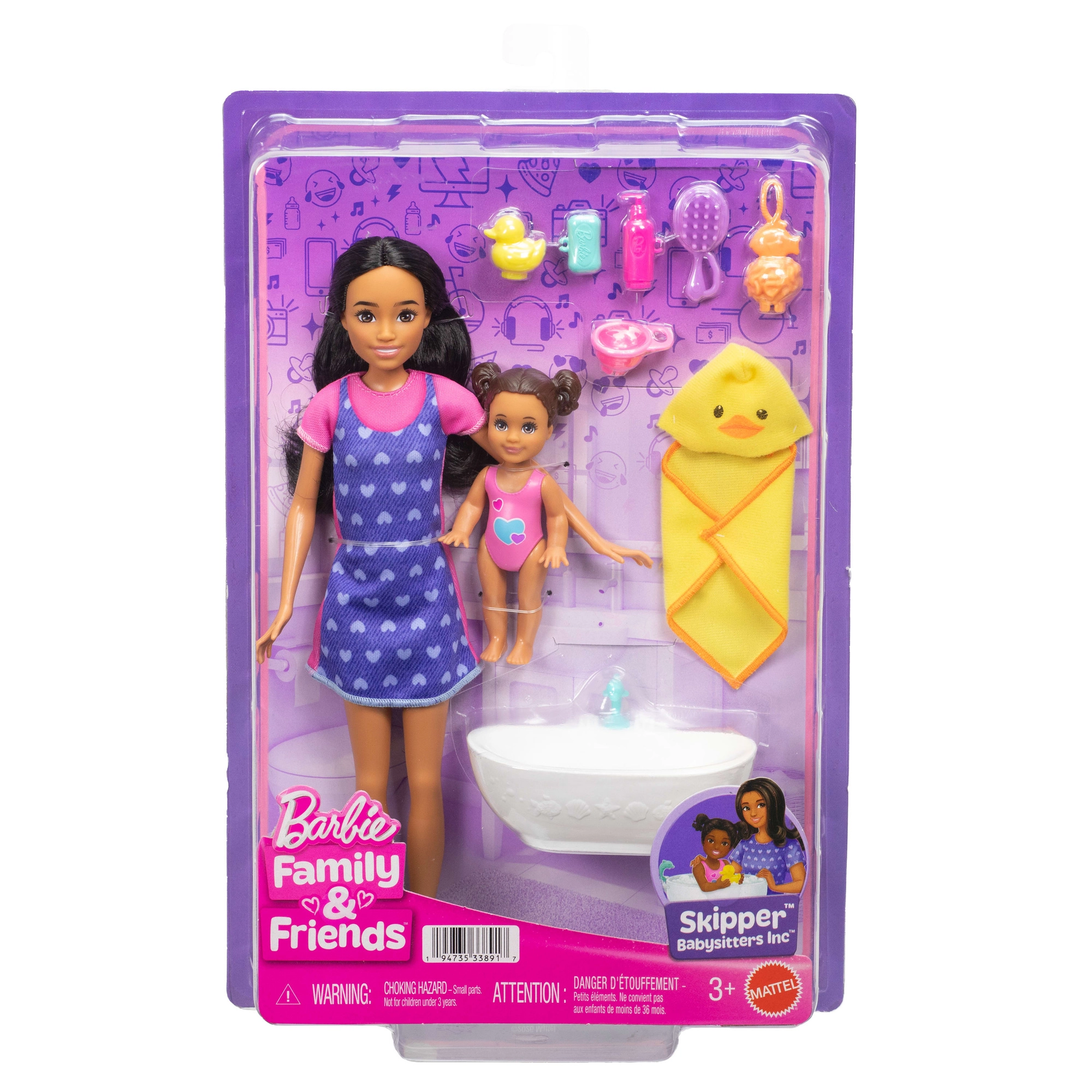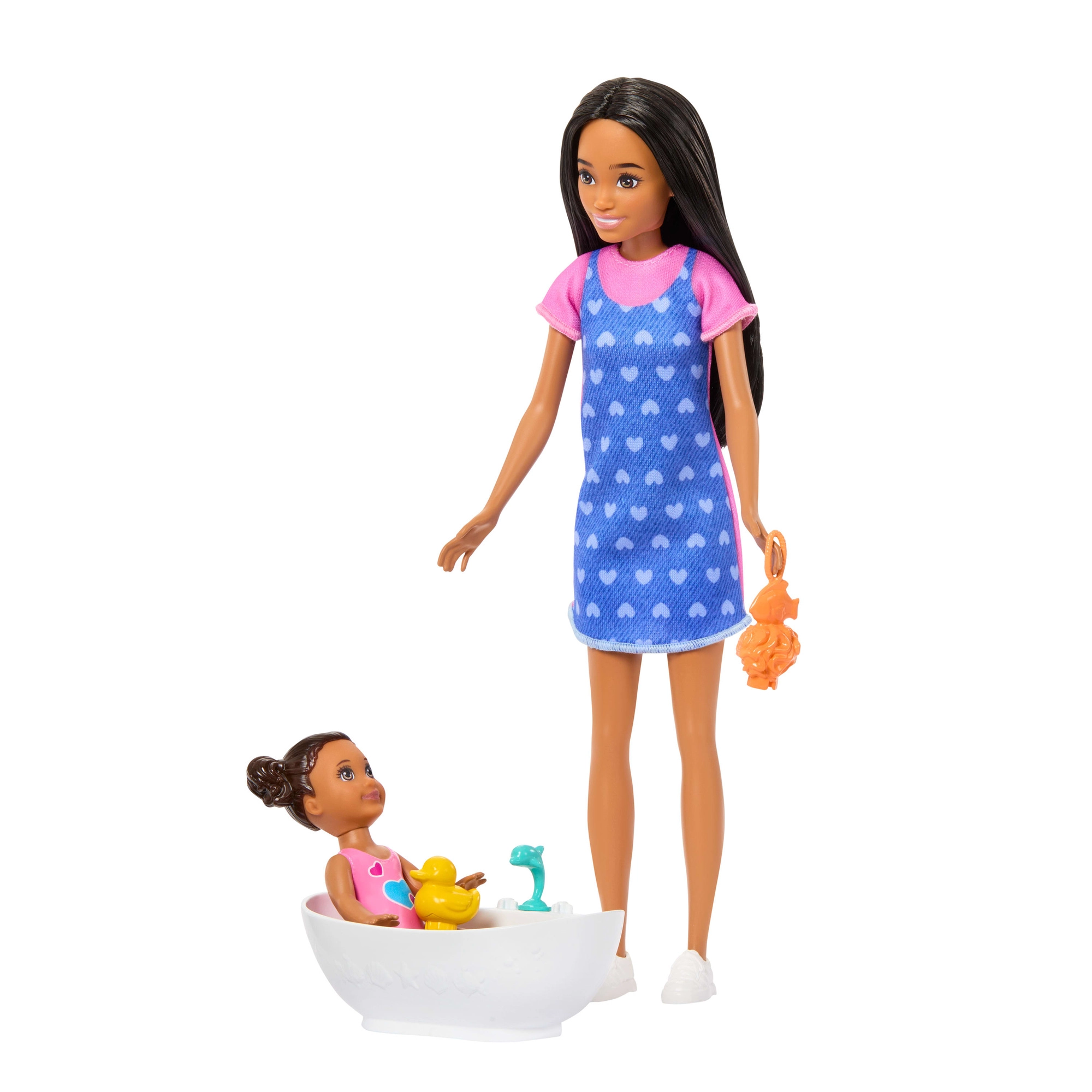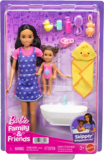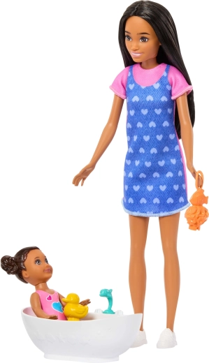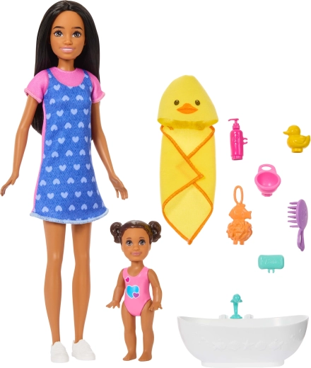 Set BARBIE Skipper Kúpanie bábätka prináša autentickú hru na starostlivosť o najmenších. Staršia sestra Skipper má na sebe šaty s modrou zásterkou so srdiečkami a pohodlné tenisky, bábätko si užíva kúpeľ vo vaničke s roztomilými doplnkami. Deti môžu znova a znova vytvárať kúpeľné rituály s kačičkou, kapucňovou osuškou a „kozmetikou“.