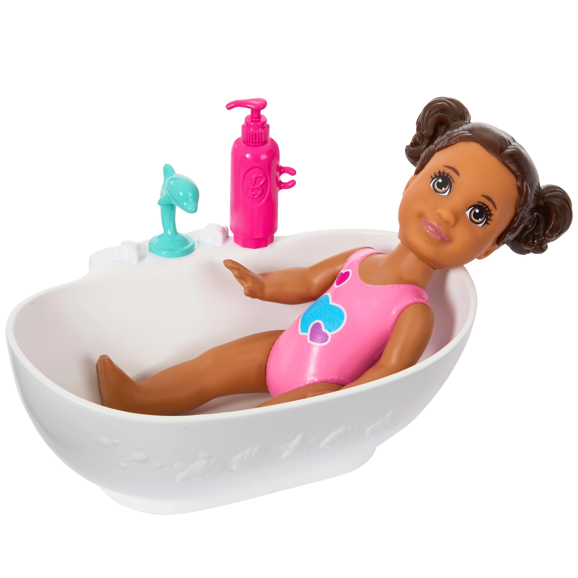 Vanička, kačička, uterák s kapucňou a ďalšie doplnky umožnia deťom vytvárať skutočné kúpeľné scénky s bábätkom a Skipper.