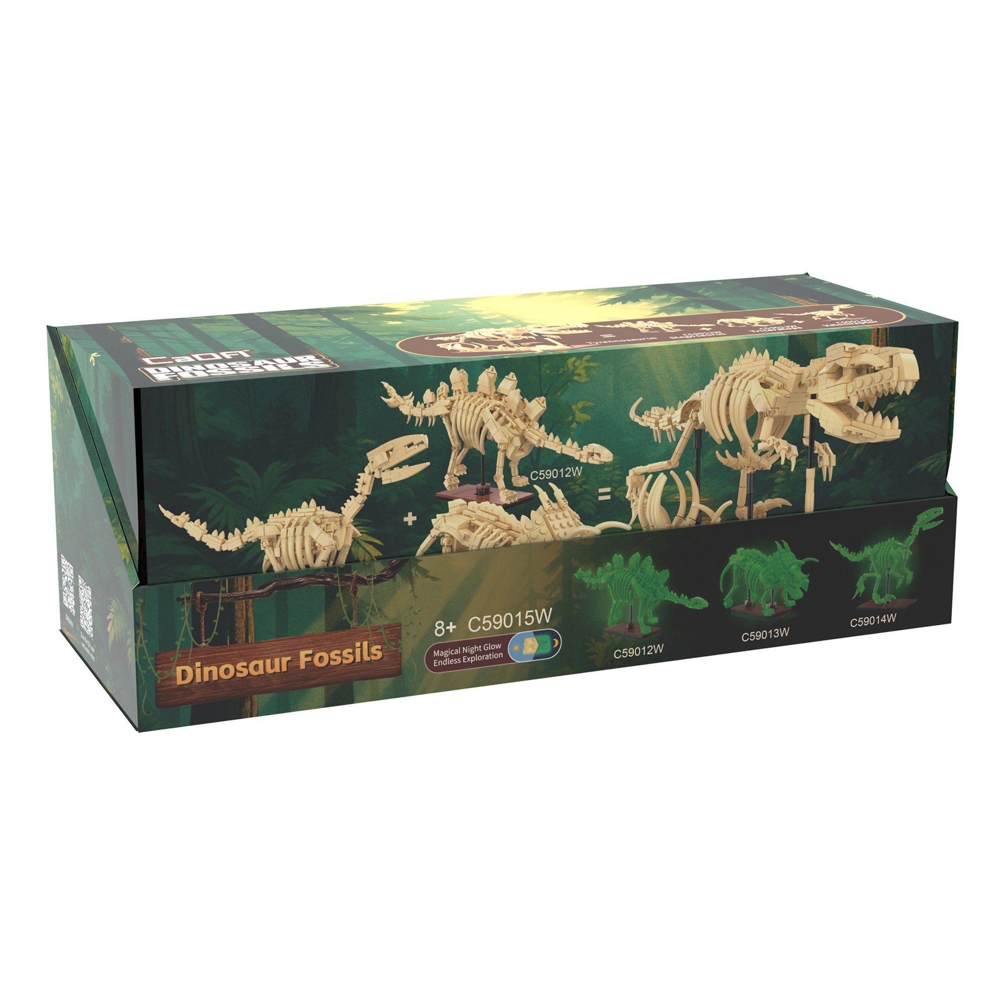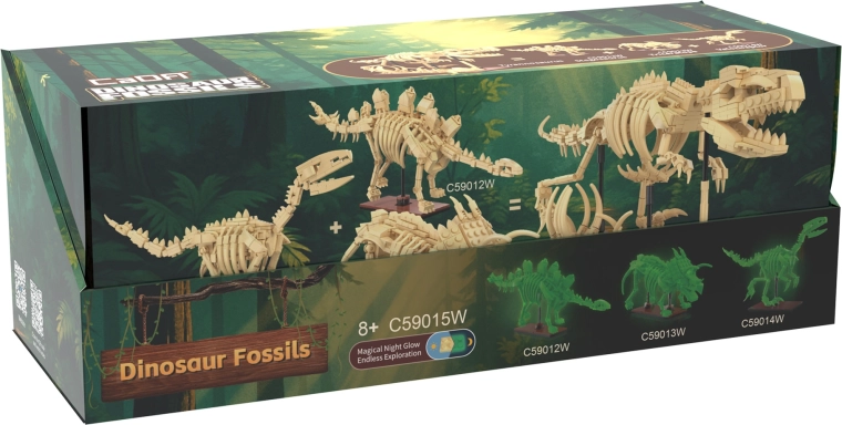 Stavebnica CaDA Dinosaur Fossils poteší malých aj veľkých fanúšikov prehistórie a vzdelávacích modelov. Z kvalitných dielikov vytvoríte tri pôsobivé kostrové exponáty s kĺbovo pohyblivými končatinami, chvostom a čeľusťou, ktoré si môžete naaranžovať do rôznych póz. Špeciálny materiál kostí svieti v tme, takže sa modely po zotmení premenia na originálnu dekoráciu.