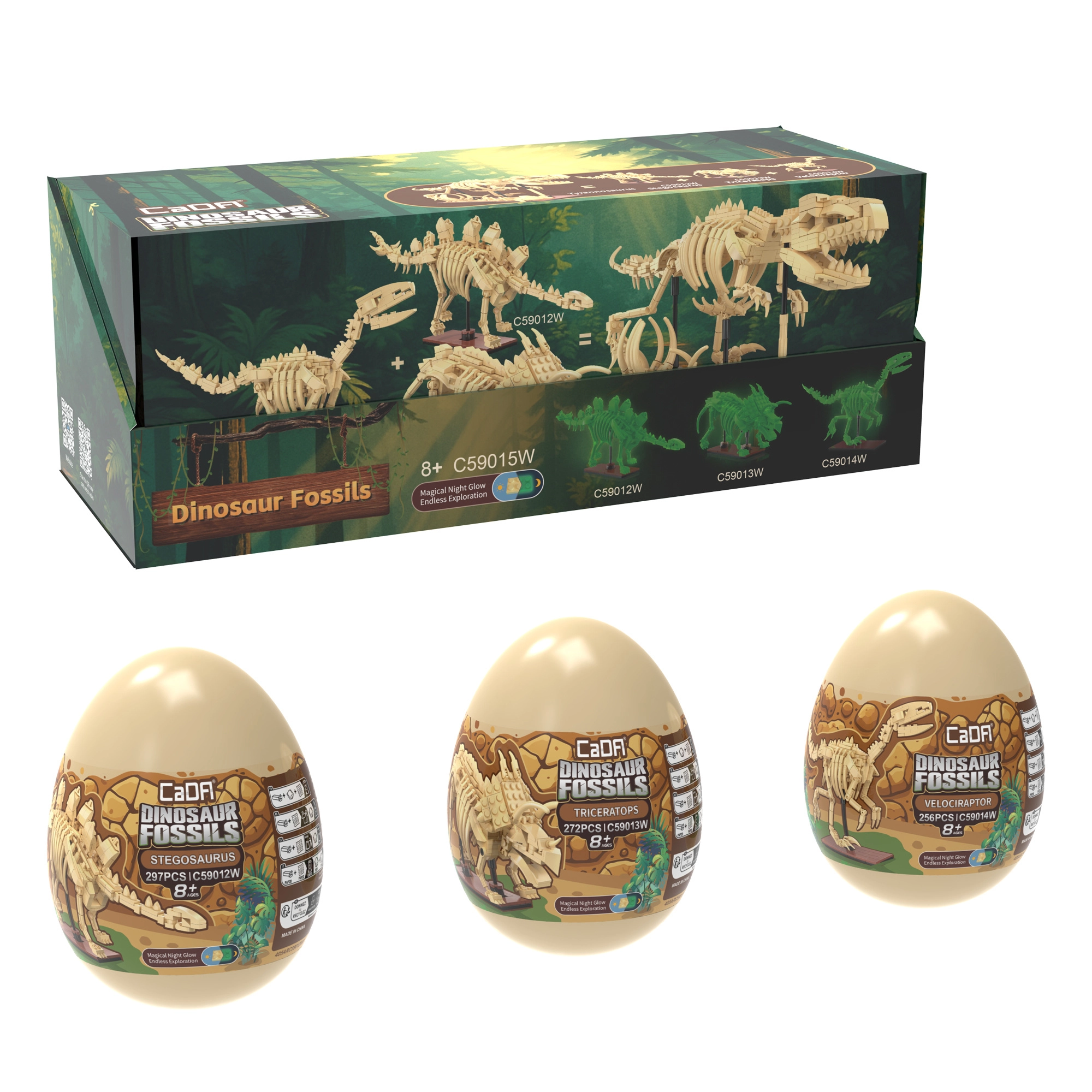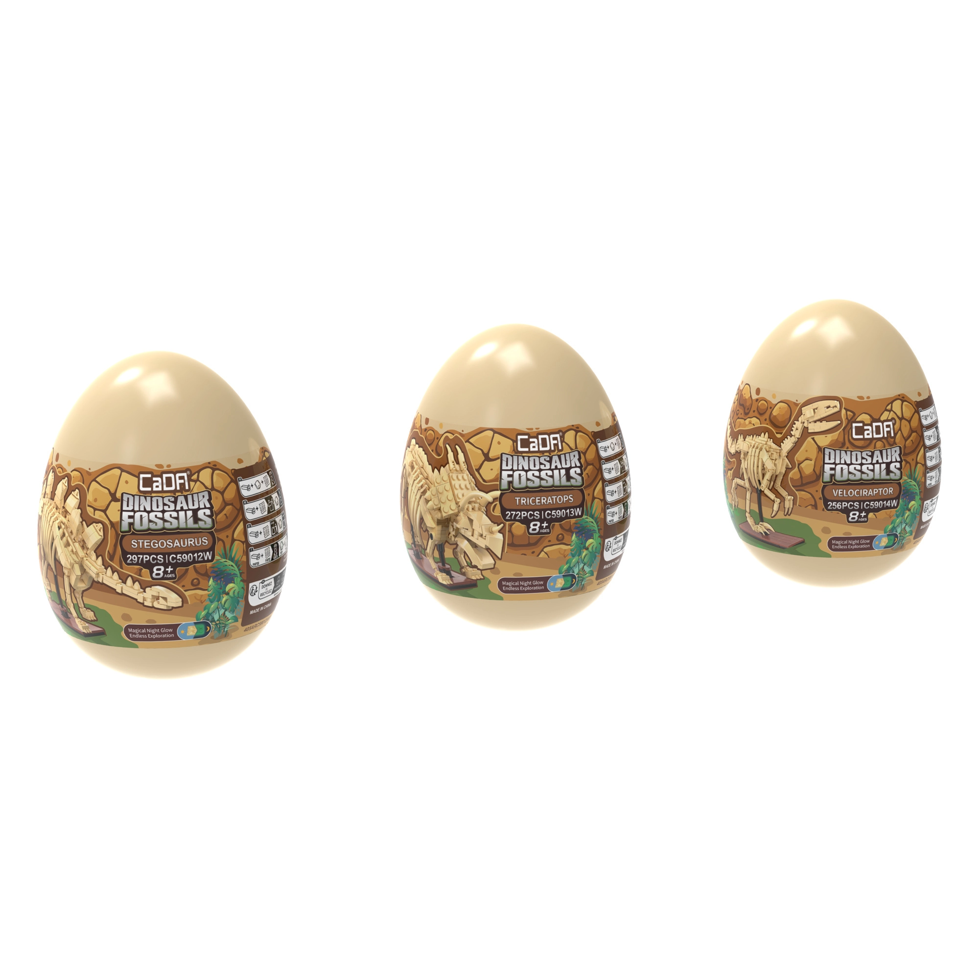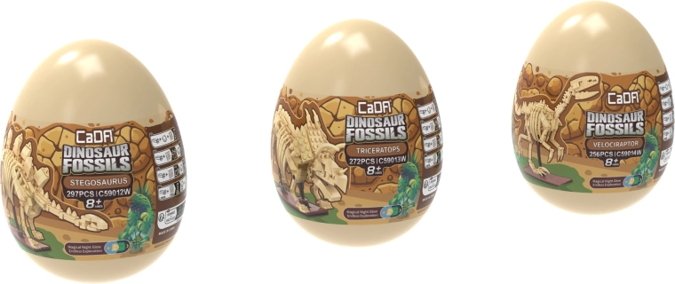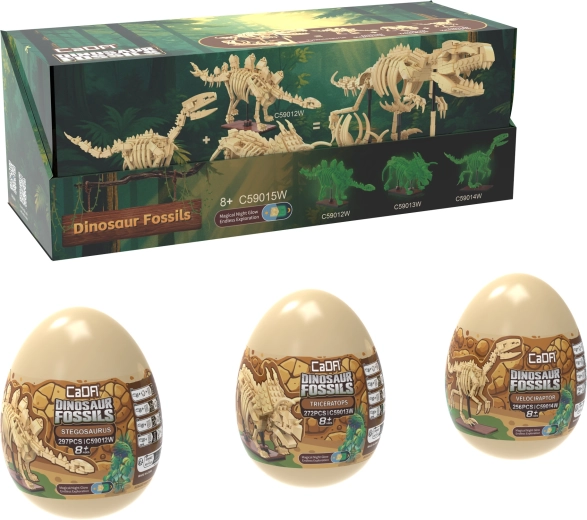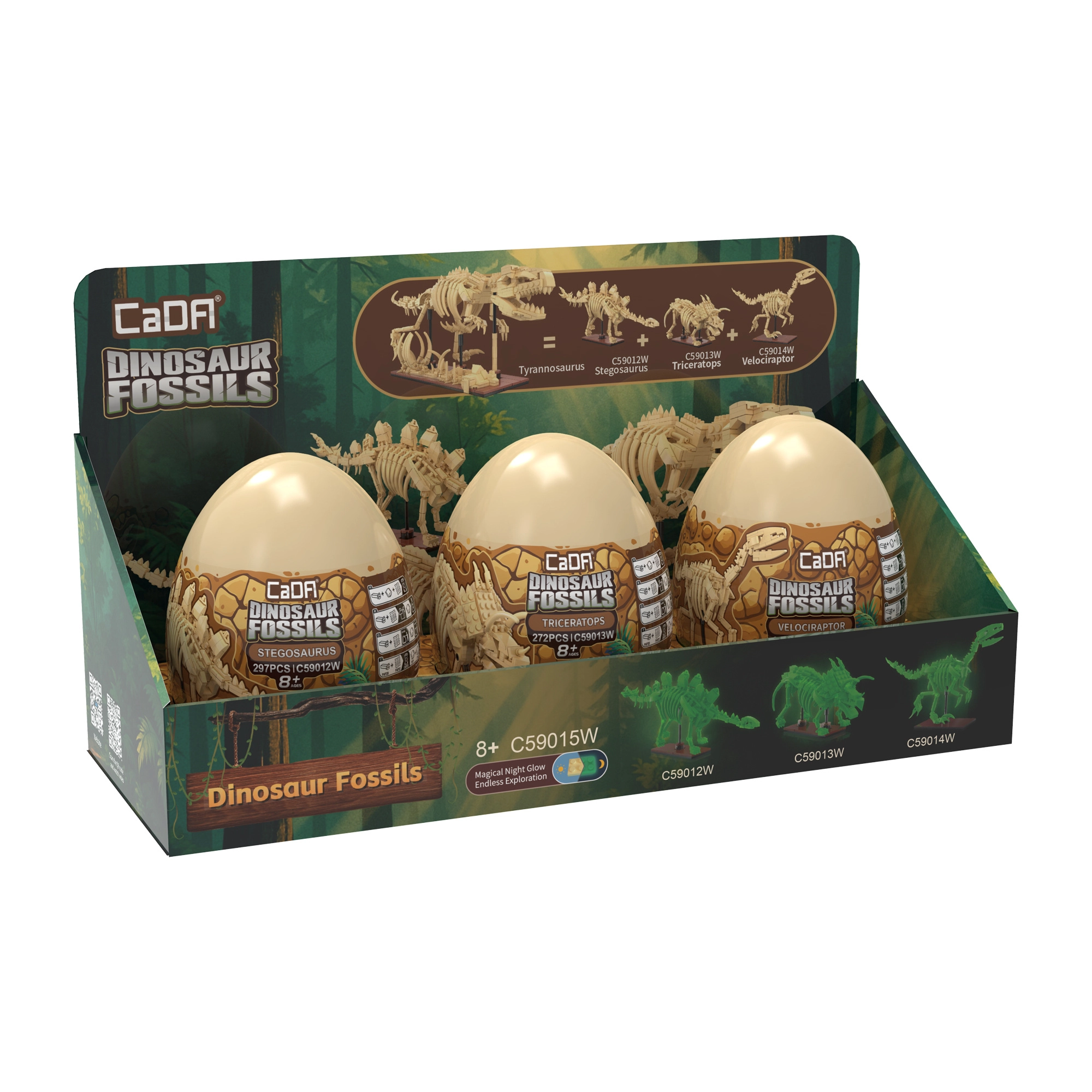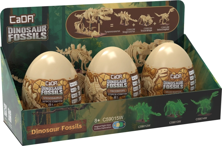 Objavte fascinujúci svet dinosaurov so stavebnicou CaDA Dinosaur Fossils. Postavte tri detailné kostrové modely – Triceratopsa, Stegosaura a Velociraptora – a následne ich spojte do impozantného TYRANNOSAURUSA REXA. Dieliky majú svietiaci efekt v tme, kĺby sú pohyblivé a set obsahuje spolu 825 kompatibilných dielikov v praktických zberateľských „vajciach“.