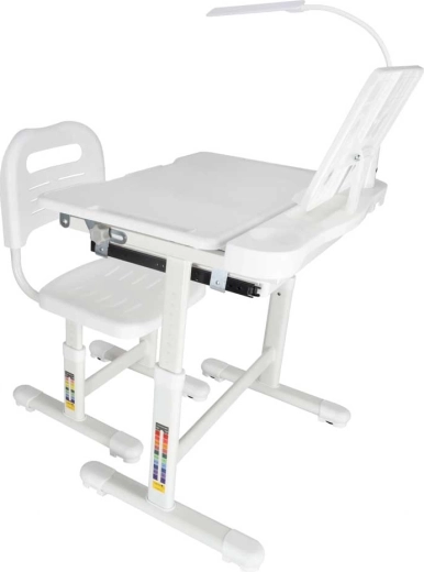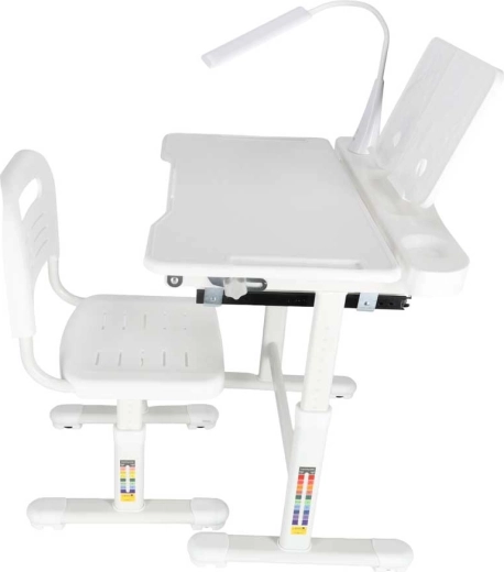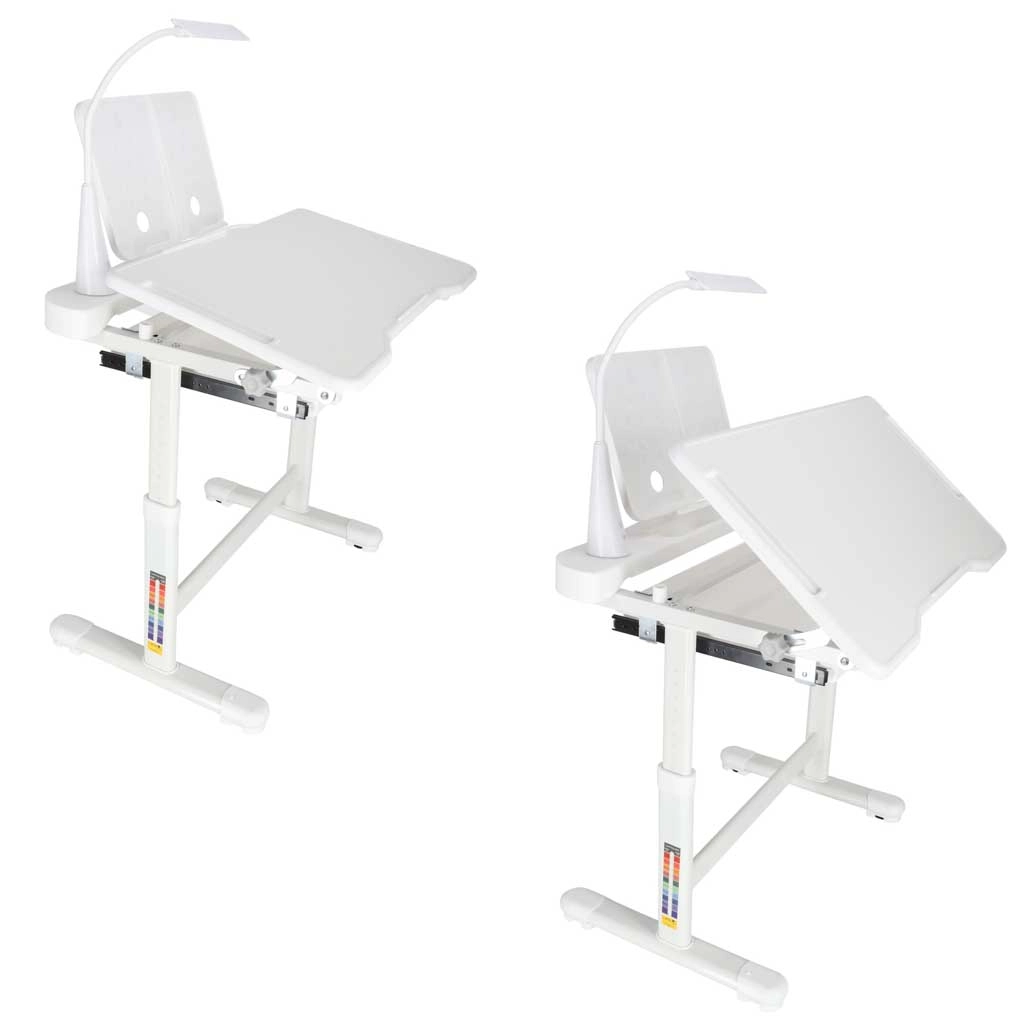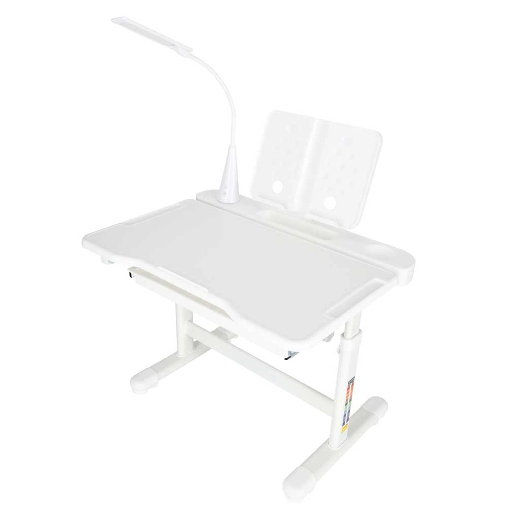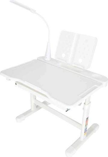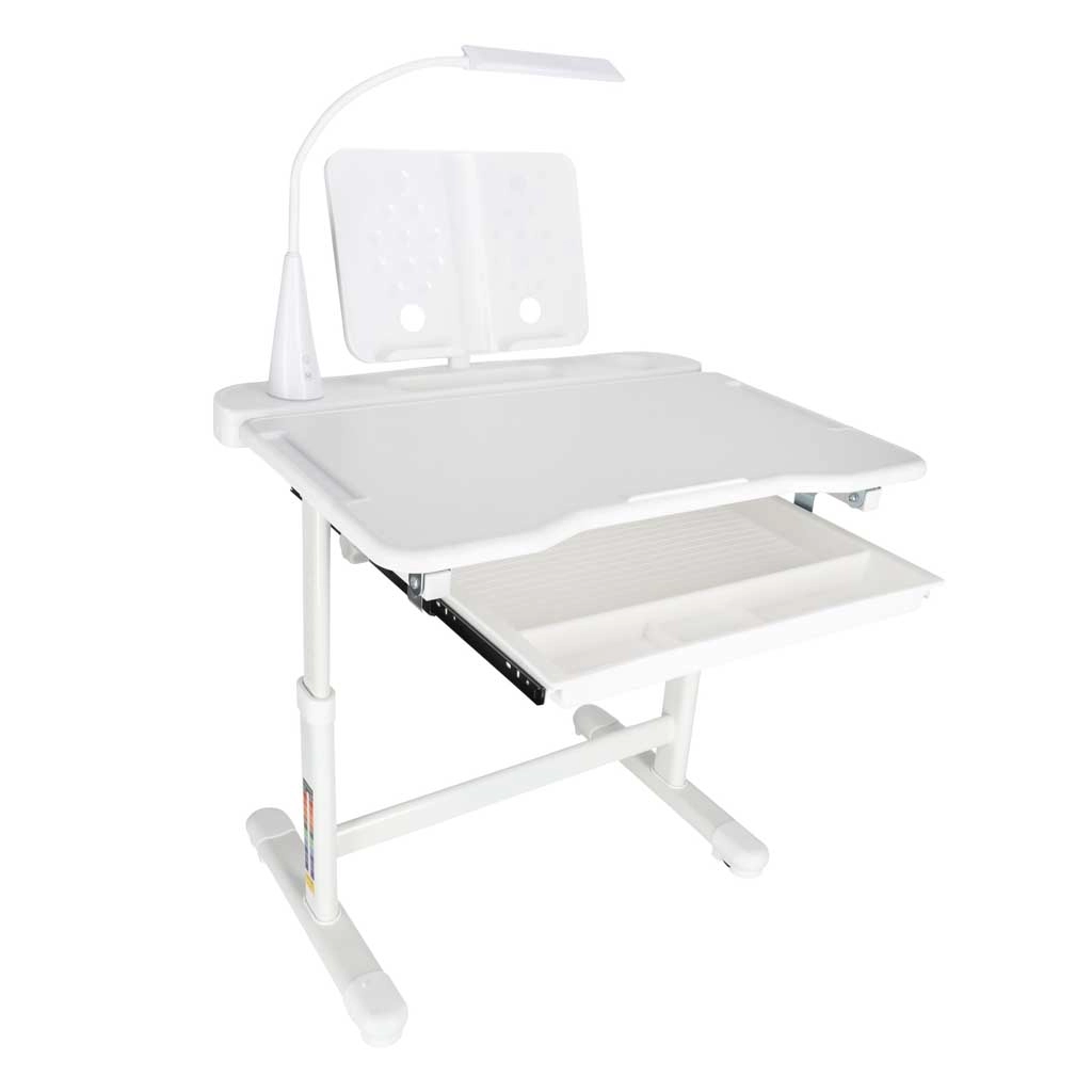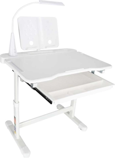Integrovaná LED lampička napájaná cez USB ponúka 3 farby svetla (teplá, studená, zmiešaná) a 3 úrovne jasu pre ideálne osvetlenie v ktorúkoľvek dennú dobu. Široká výsuvná zásuvka s priehradkami a stojan na knihu/tablet udržia pomôcky prehľadné a po ruke. Bezpečné zaoblené hrany a pevná rámová konštrukcia z kovu, MDF a plastu zaisťujú stabilitu a dlhú životnosť.