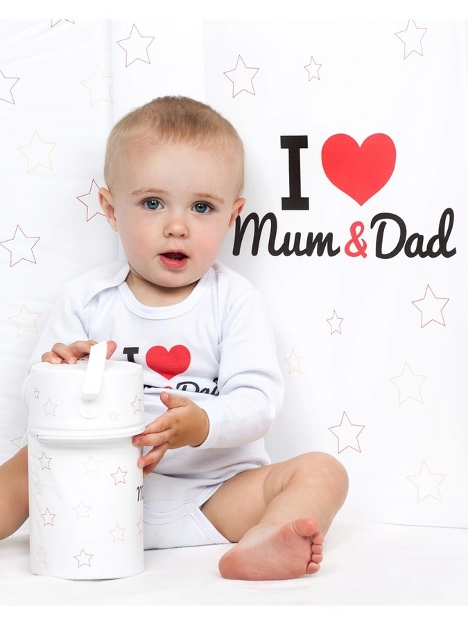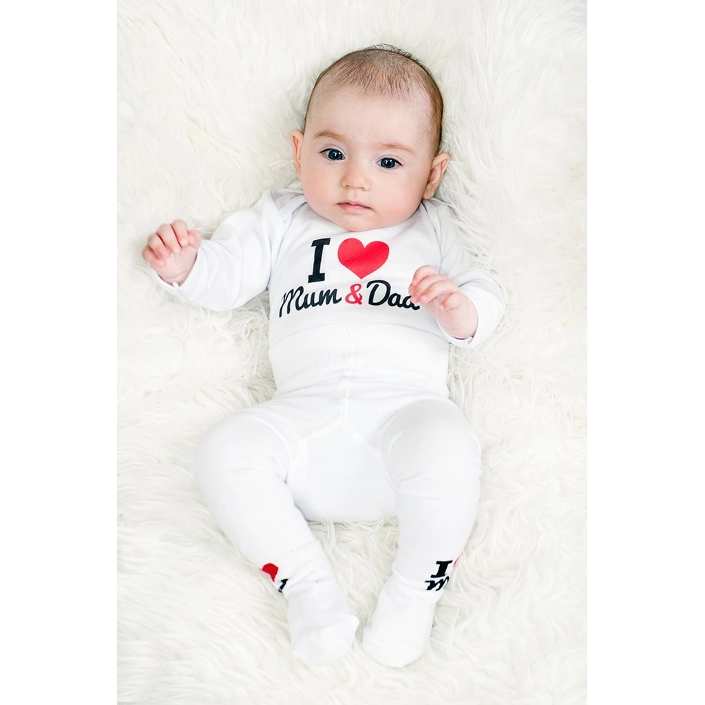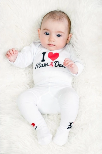 Roztomilé a pohodlné detské body s dlhým rukávom od značky New Baby s vtipným nápisom I love Mum and Dad. Vyrobené zo 100% bavlny pre hebkosť a priedušnosť, s certifikovanými farbami vhodnými pre bábätká. Praktické zapínanie na patentky na ramienku a medzi nožičkami uľahčuje obliekanie aj prebaľovanie.