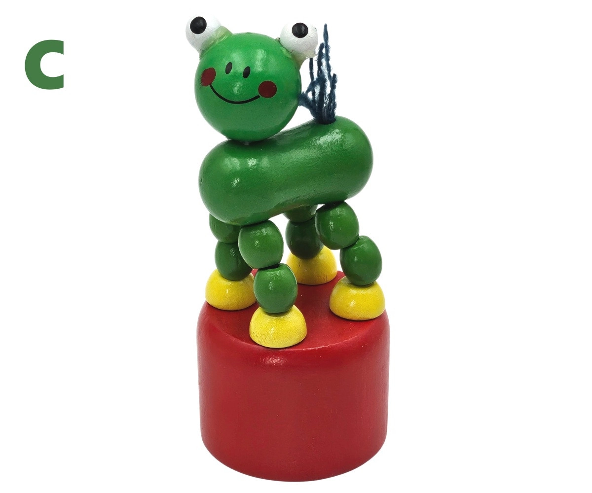 Objavte čaro klasickej drevenej hračky, ktorá rozvíja detskú fantáziu aj jemnú motoriku. Po stlačení podstavca sa zvieratko rozhýbe, komicky sa zahupne a roztancuje – ideálne na krátke hravé chvíľky doma aj na cestách.