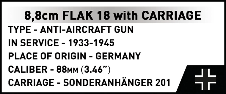 Táto klasická verzia slávneho kanónu 8,8 cm FLAK 18 prináša autentický model s prepracovanými detailmi a funkčnými prvkami na display aj hranie. Vďaka krížovej lafete umožňuje rýchle natočenie v rozsahu 360° a realistické mierenie, čo zvýrazňuje technickú eleganciu tejto historickej ikony druhej svetovej vojny.