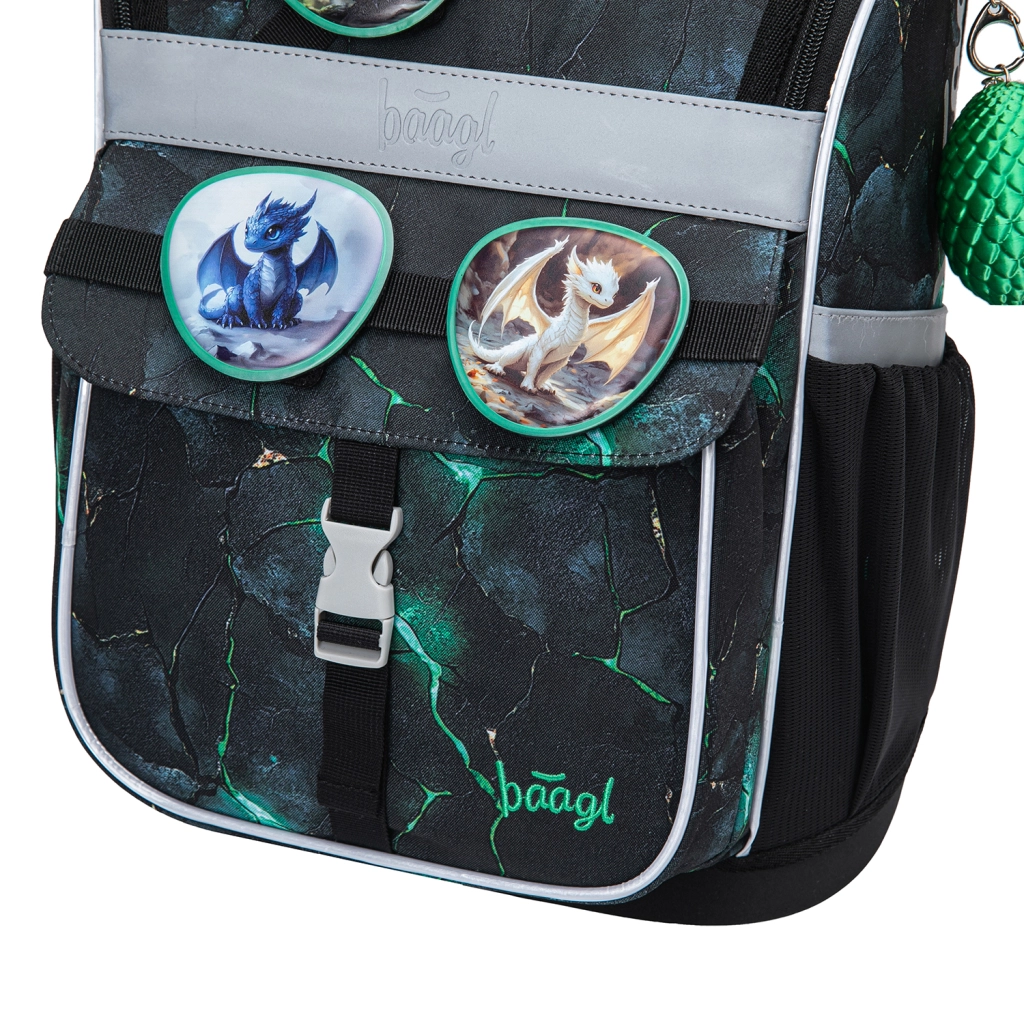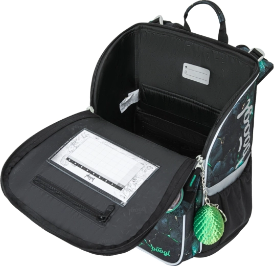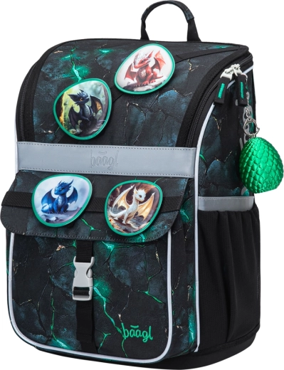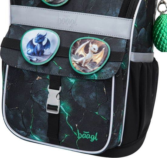 Reflexné prvky pre lepšiu viditeľnosť, vodoodolný materiál a spoľahlivé zipsy YKK. Vymeniteľné odznaky a dračí motív dodajú aktovke osobitý vzhľad.